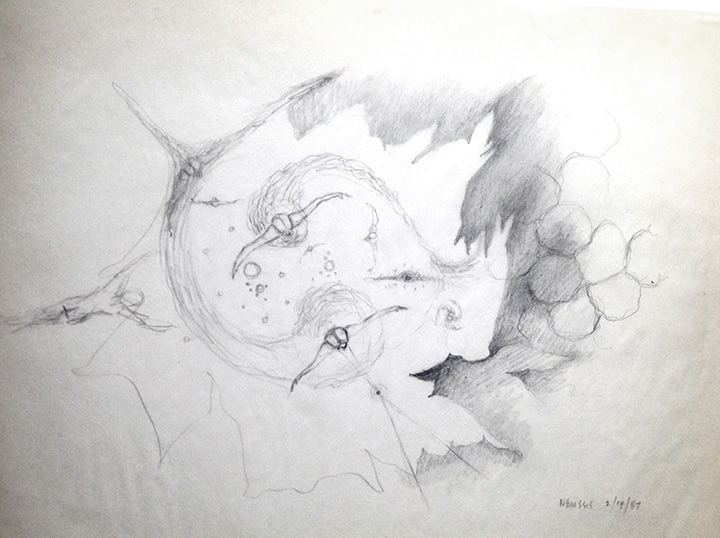 <- Nemesis, 1957, pencil on tissue, 12 x 8  ->