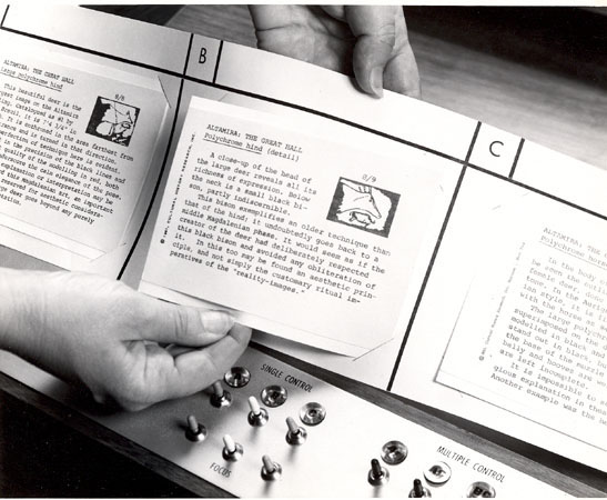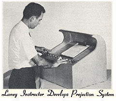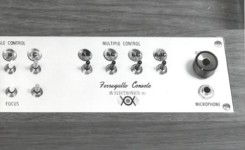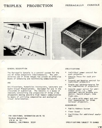 Multiple screen projection was very important and with the help of an equipment donation from the Eastman Kodak Company this lead in 1966 to the design of a unique lectern which controlled three projectors in a piano like responsive arrangement allowing for comparative and analogical image arrays to be projected in any of seven possible combinations.