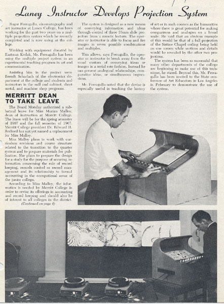 Roger Ferragallo's Peralta Community College District (PCCD) career as an administrator and instructor of art, cinema, television and photography spanned a period of over 32 years in Oakland, California (from 1960 through 1992). In 1960 at Laney College Ferragallo founded and chaired the department of Art and co-founded and chaired the department of (television) Media Communications. From 1980 through 1992, he founded and served as the Director of Telecommunications and General Manager of Peralta Colleges Television (PCTV) until he retired in 1992.